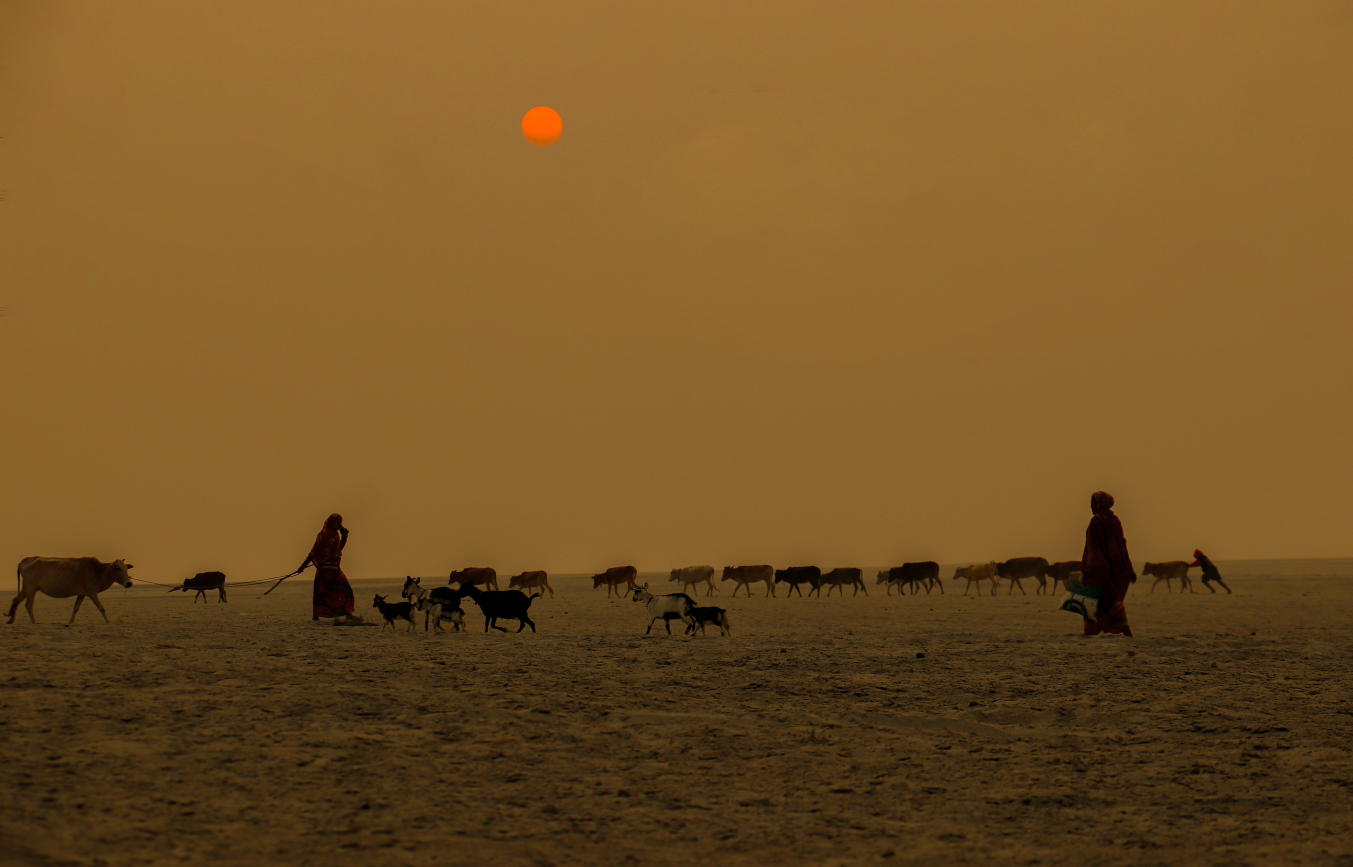 Dusk choirs: This photograph is of cattle herders returning with their herd during sunset on the bank of river Brahmaputra. The vast stretch of sand makes a spectacular sunset creating a surreal ambience.